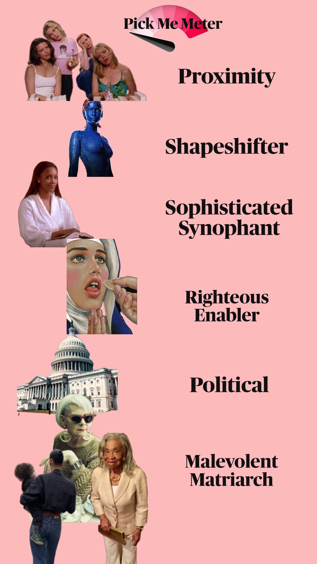 These women-commonly known as "pick me women" —are the apologists of internalized misogyny. They'll defend harmful behaviors, shame other women, and look the other way when abuse happens, all to secure their precious spot in the hierarchy of male approval. Self-respect and solidarity isn’t so rewarding if there isn’t a man to impress. I have this invisible scale in my mind with how deep this pick me shit can go, we’ll touch on that in a sec.